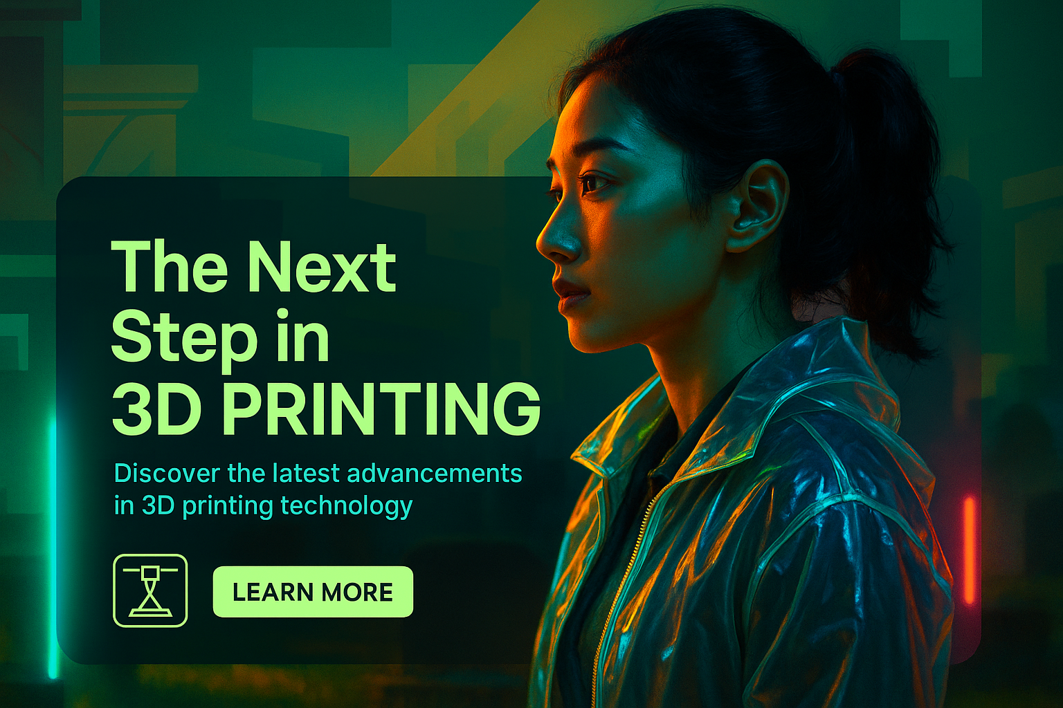 Vibrant promotional graphic showcasing advancements in 3D printing technology, featuring a profile of a woman in a glowing environment, ideal for tech marketing.