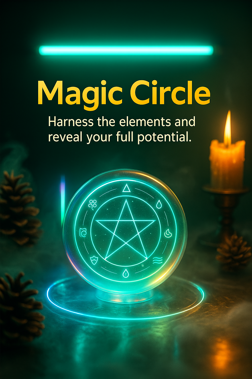 /Collection: /by davooda/Type: PNG/A mesmerizing neon magic circle illuminated by soft glowing lights, featuring symbols and a candle, creating an ethereal atmosphere. The text encourages harnessing one's potential.
