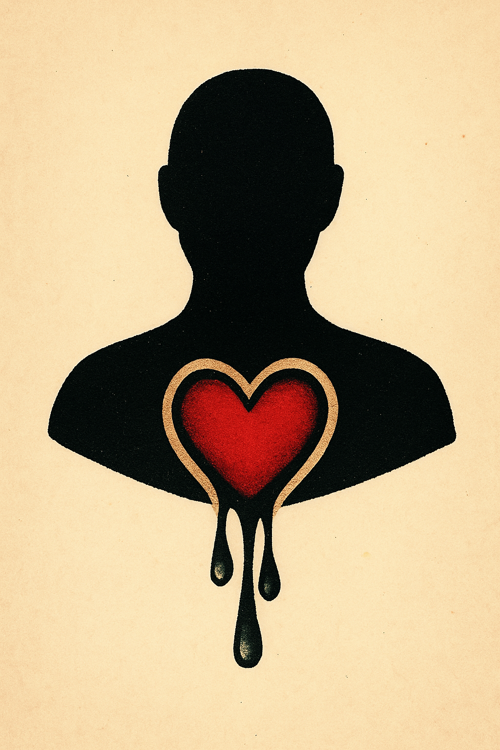 /Collection: /by davooda/Type: PNG/A striking silhouette of a person with a heart at the center, dripping black liquid. The design features red and gold accents on a light beige background, reminiscent of classic tattoo art.