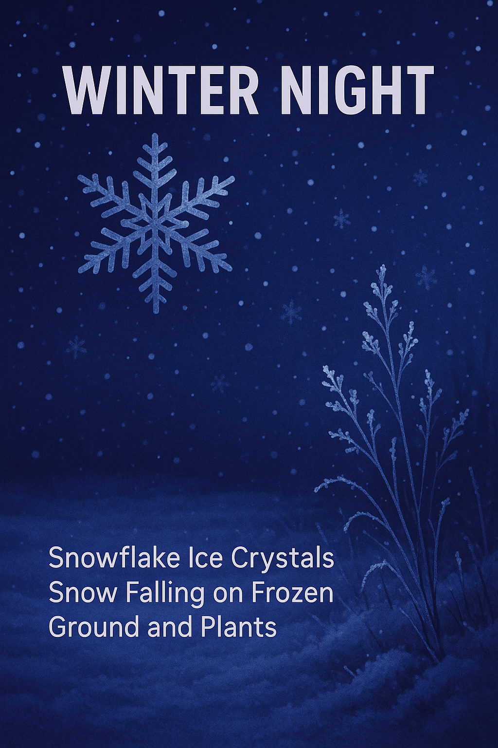 A beautifully designed graphic depicting a winter night theme featuring snowflakes and frozen plants, suitable for seasonal promotions or holiday-themed content.