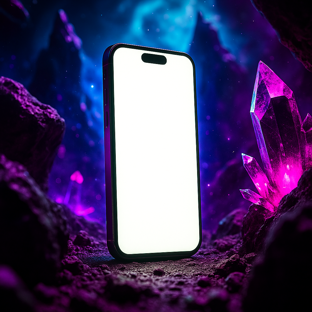 A visually striking mockup of a smartphone set against a vibrant, mystical background featuring glowing crystals, ideal for tech promotions or digital displays.