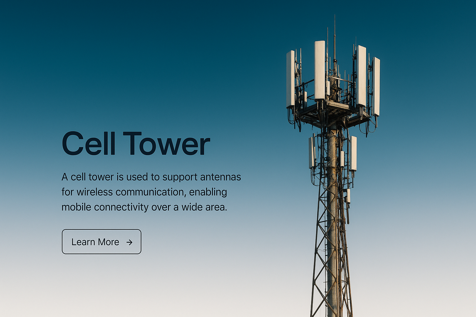 A modern cell tower stands against a gradient sky, featuring antennas for wireless communication. Accompanied by a clear call-to-action button.