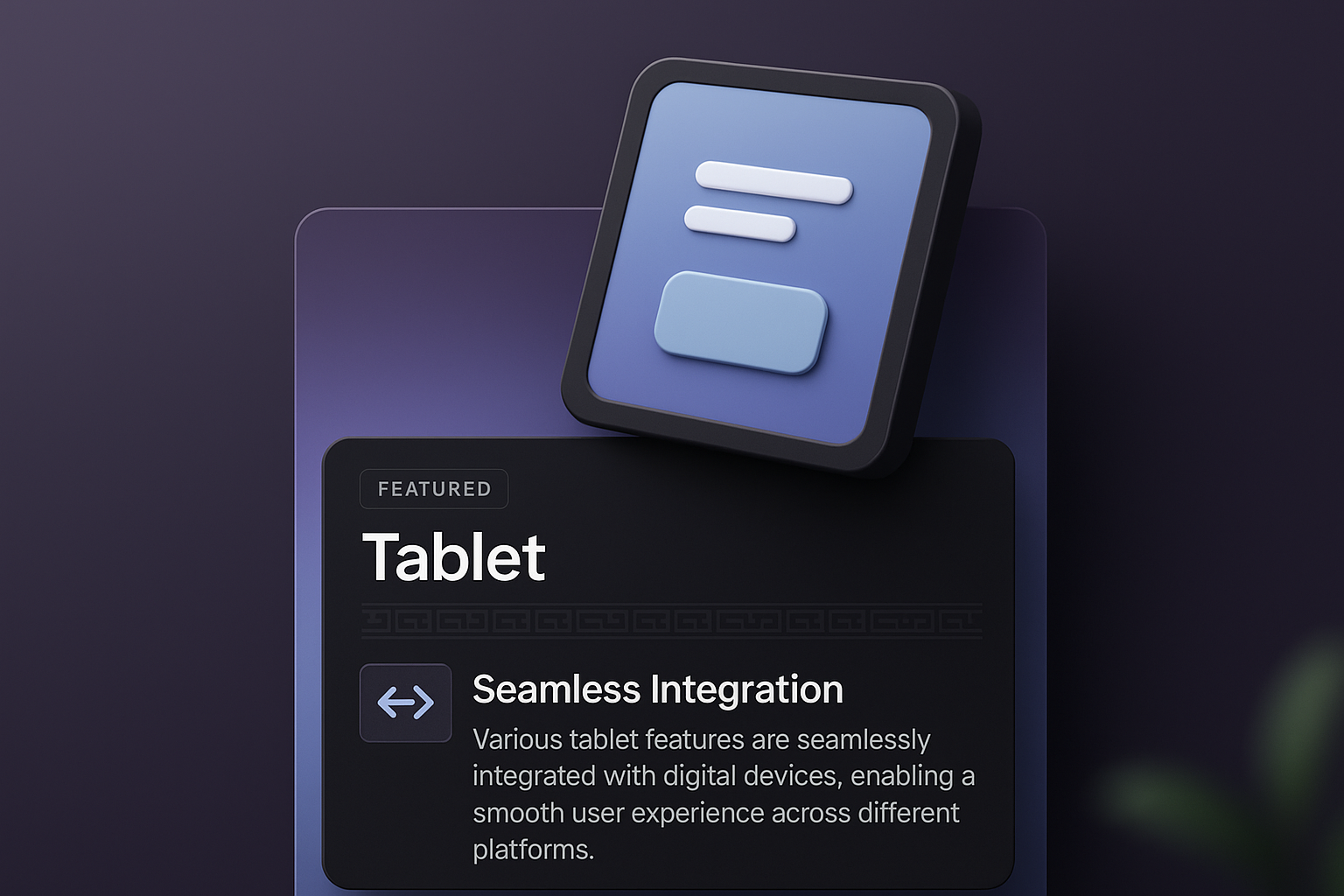 /Collection: /by davooda/Type: PNG/A modern 3D illustration of a tablet featuring a sleek design. The layout includes a dark panel with descriptive text, a highlighted title, and a user-friendly interface, emphasizing seamless integration.