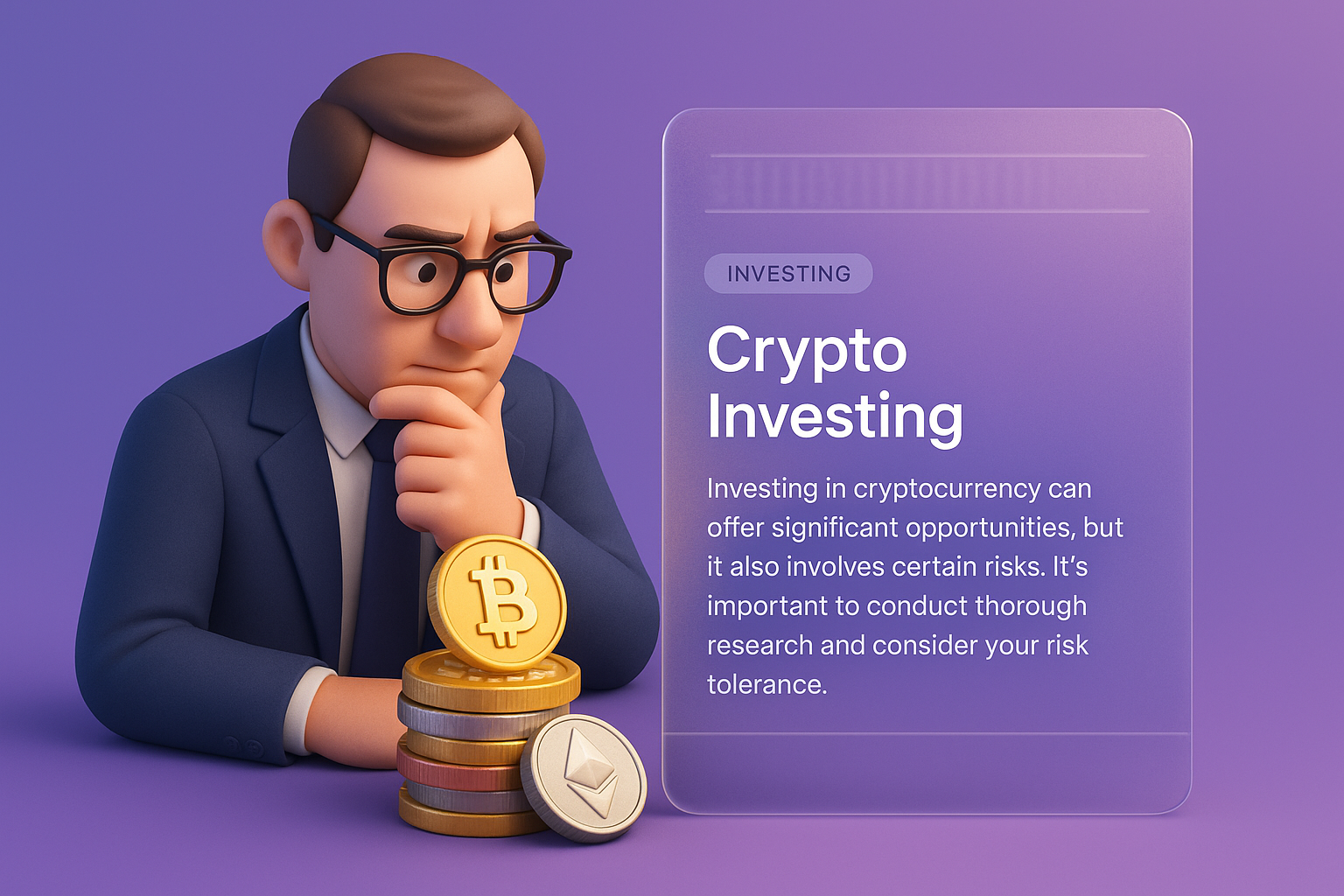 /Collection: /by davooda/Type: PNG/A 3D illustration of an investor contemplating a stack of cryptocurrency coins, with a transparent information block detailing crypto investing insights.