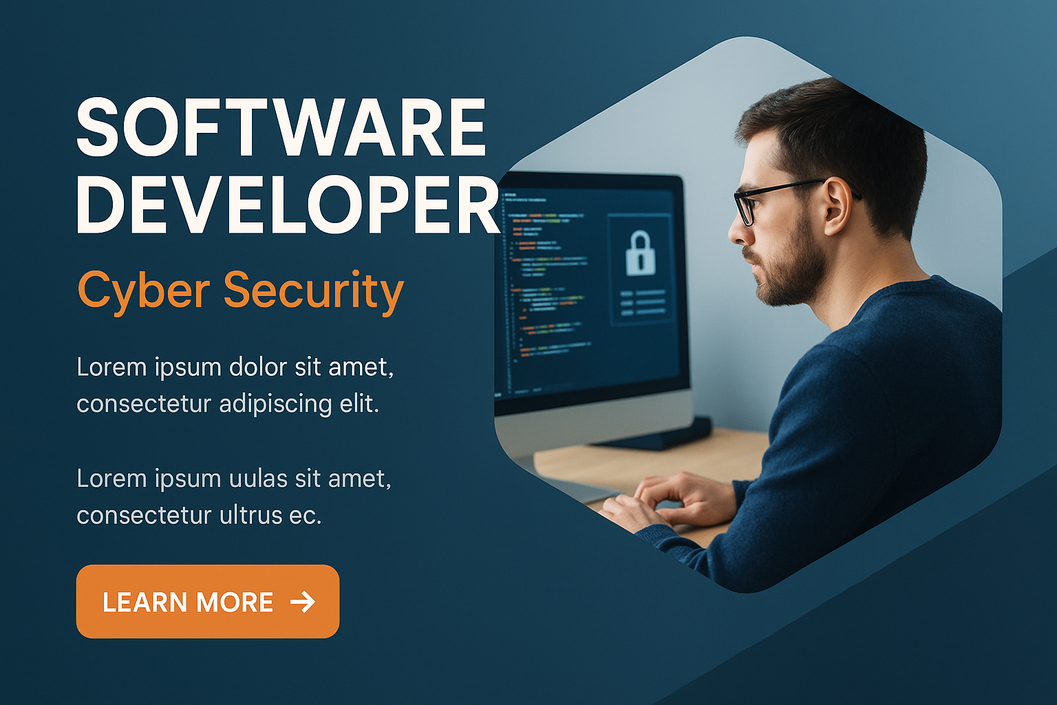 /Collection: /by davooda/Type: PNG/A software developer is engaged in coding at a computer, emphasizing cyber security. The design features a professional layout with a structured hierarchy and engaging color scheme.