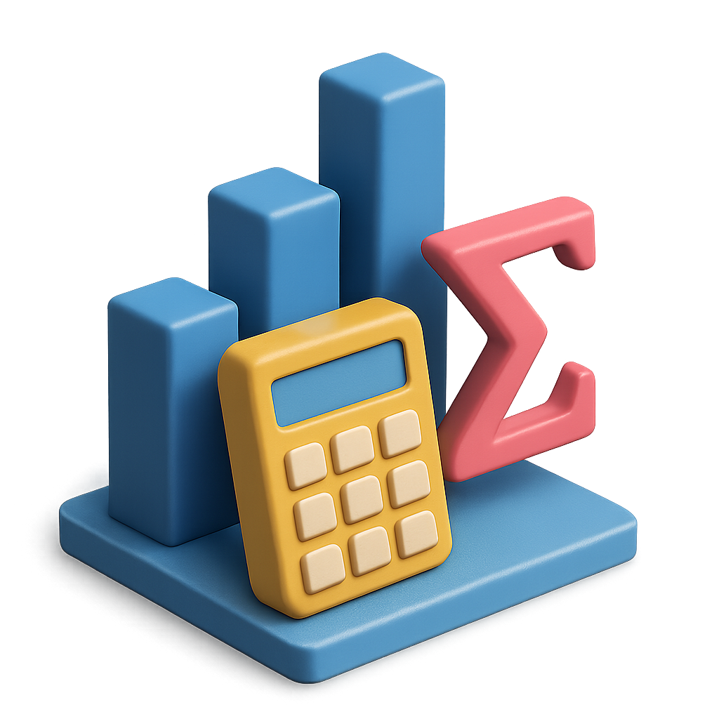 /Collection: /by davooda/Type: PNG/A vibrant 3D icon featuring a calculator, bar graph, and summation symbol on a blue base. The design has an isometric and volumetric feel, perfect for quantitative themes.