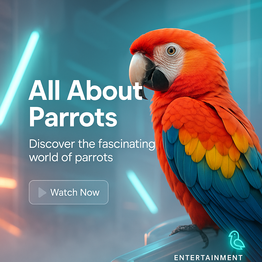 Engaging promotional image showcasing a colorful parrot with modern design elements aimed at attracting viewers to learn more about parrots.