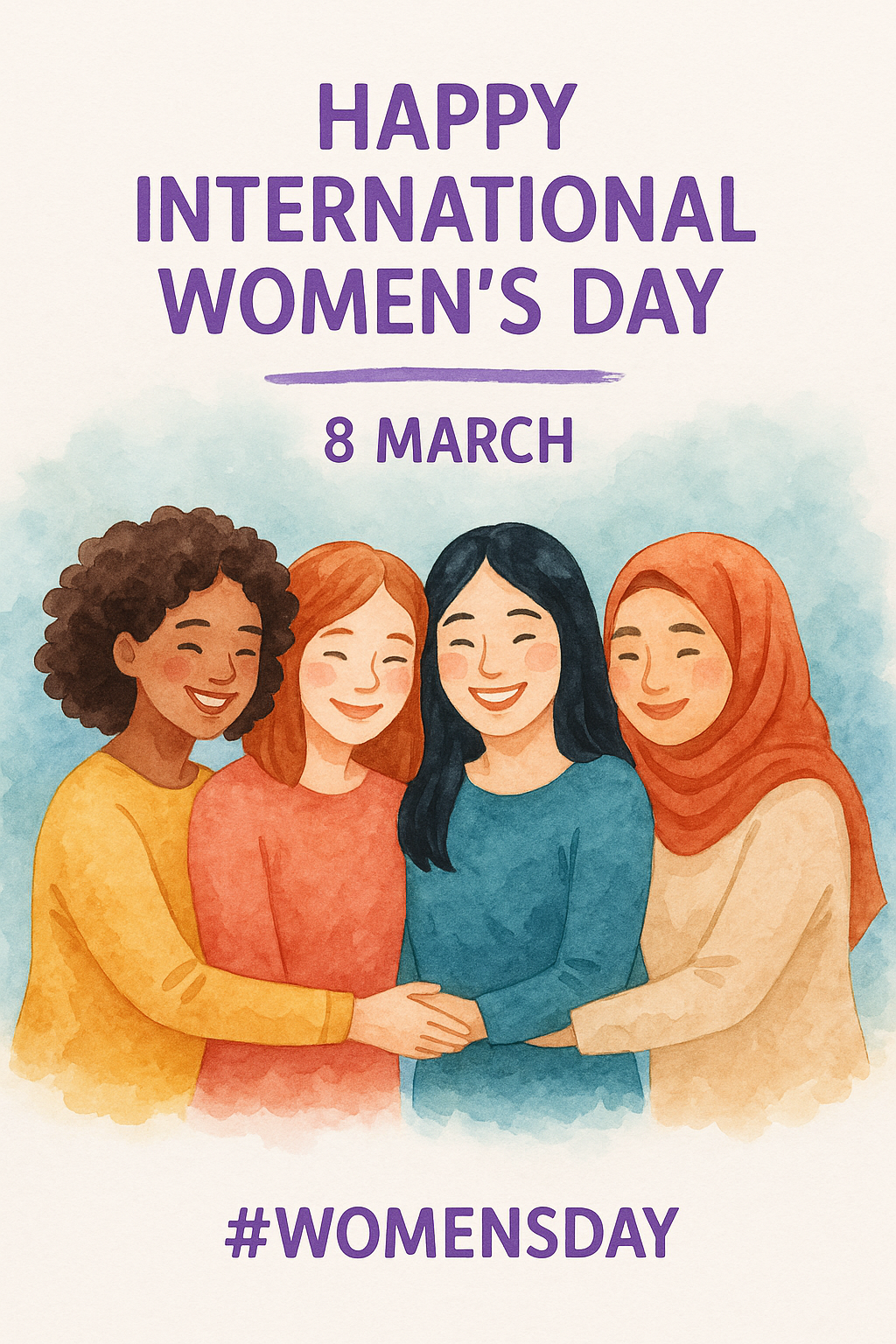 /Collection: /by davooda/Type: PNG/A vibrant and cheerful illustration celebrating International Women's Day, featuring diverse women embracing each other, ideal for social media and awareness campaigns.