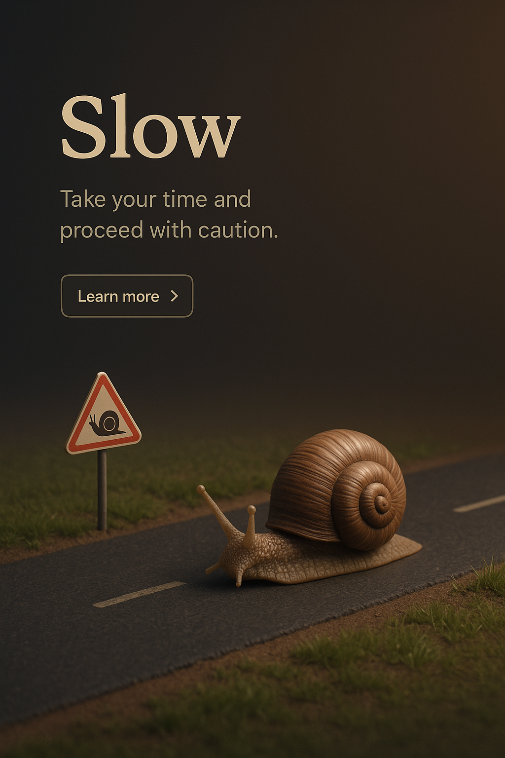 A realistic 3D scene featuring a snail on a road, complemented by a caution sign. The dark gradient background enhances the visual, making it engaging and inviting.