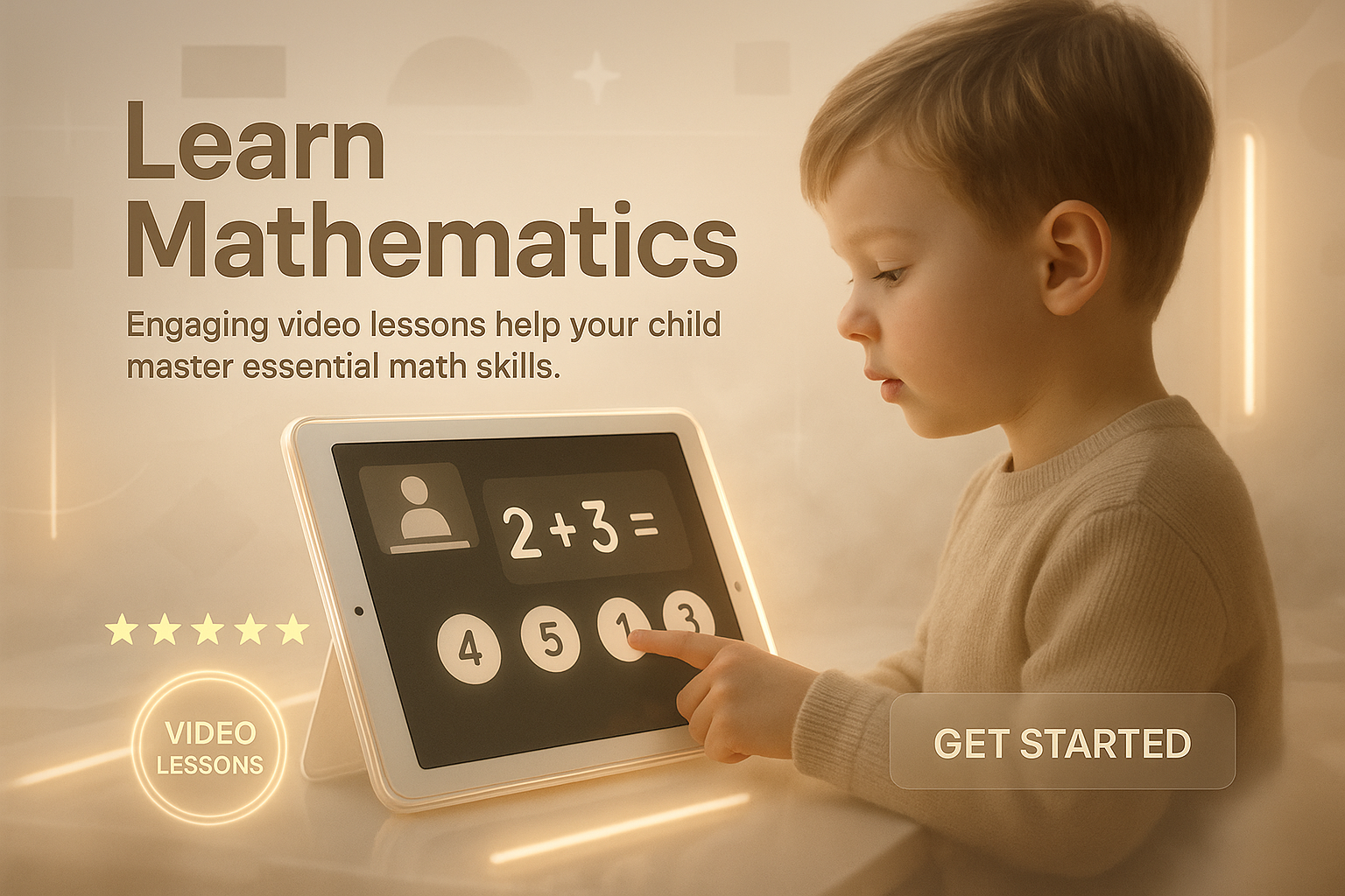 Engaging promotional graphic featuring a child learning math through video lessons on a tablet. Ideal for educational marketing targeting parents.