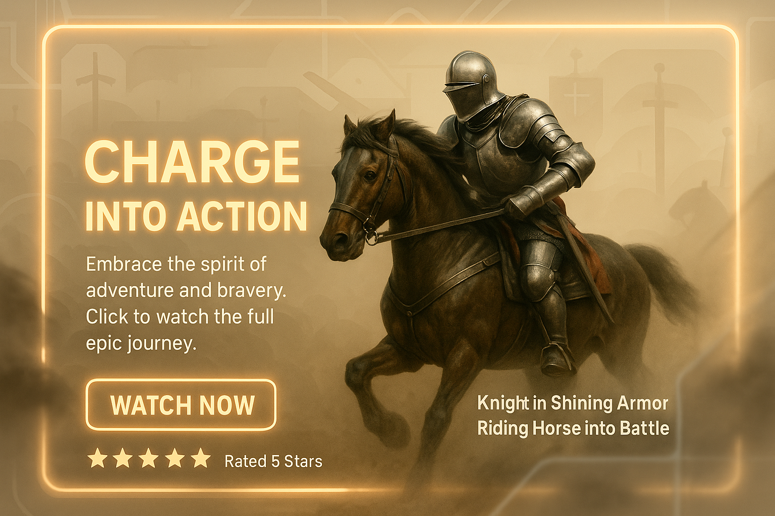 Engaging promotional banner for an adventure video, featuring a knight on horseback in shining armor. The design is vibrant and cinematic, aimed at audiences interested in action and fantasy.