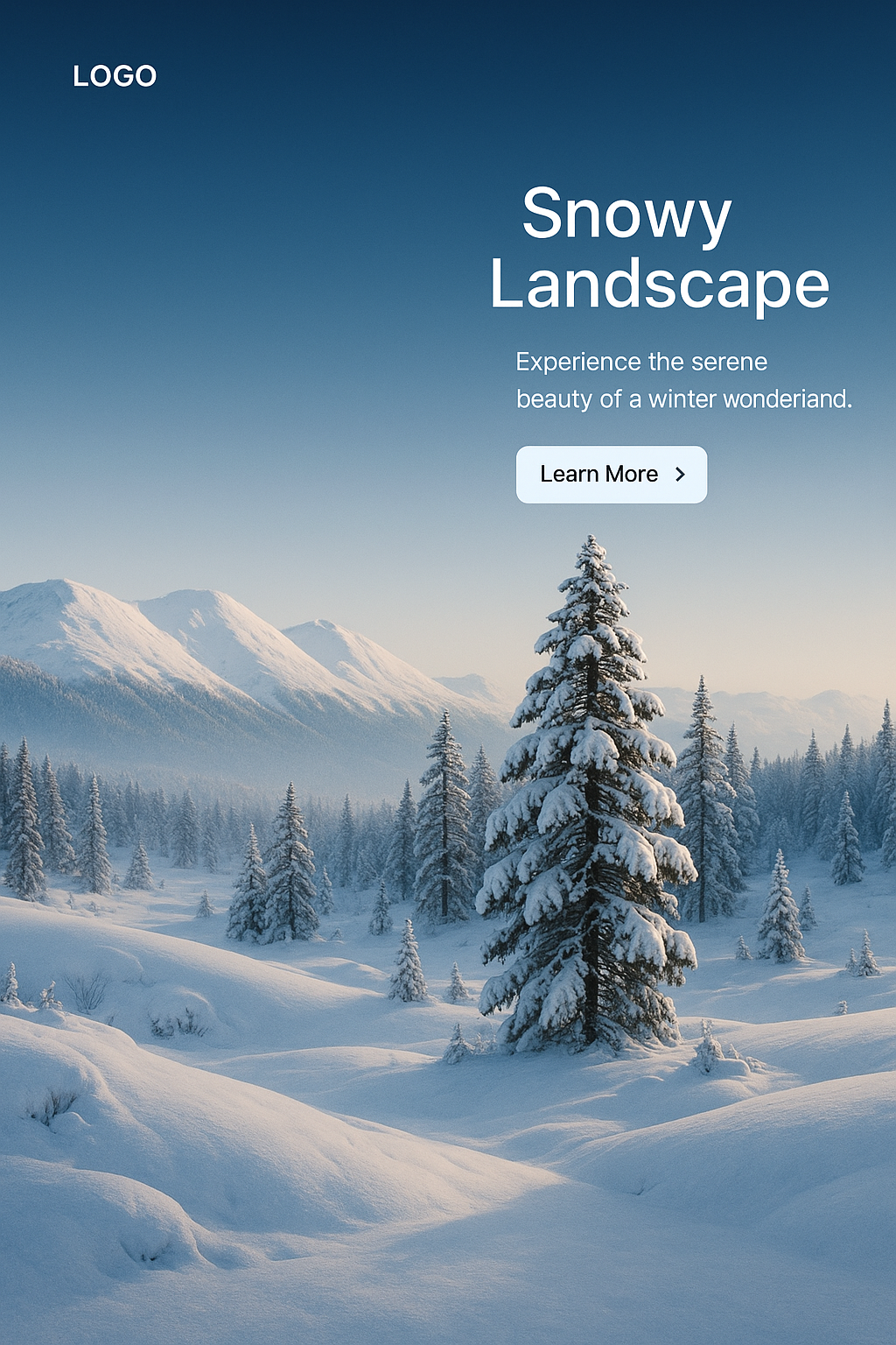 A stylish web layout showcasing a snowy landscape, featuring a serene mountain backdrop, a prominent snow-covered tree, and a clean, modern design for user interaction.
