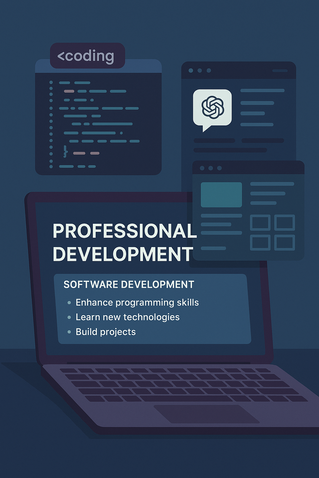 /Collection: /by davooda/Type: PNG/Engaging graphic focused on professional development in software skills, featuring a laptop and coding elements, ideal for educational or career-related content.