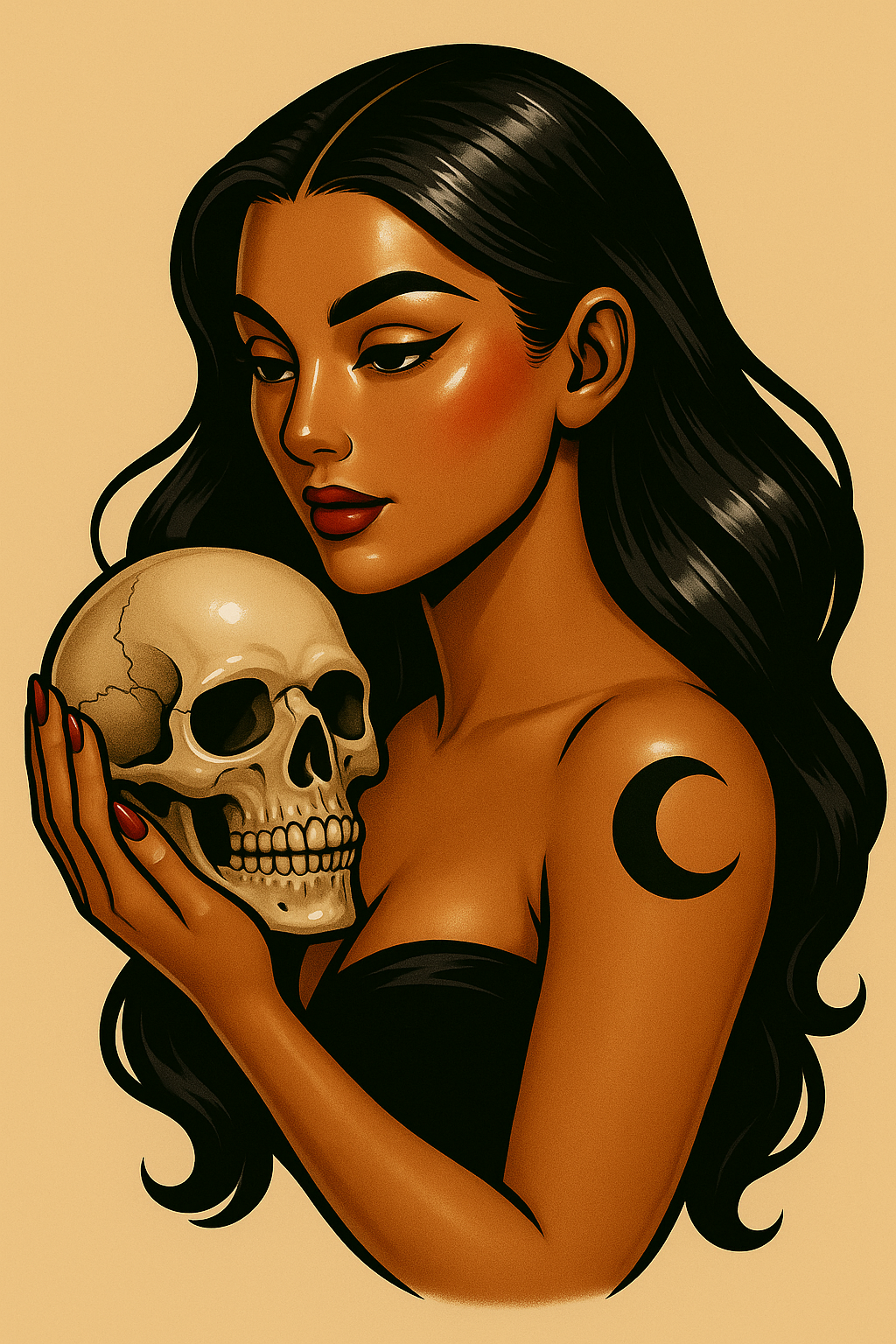 /Collection: /by davooda/Type: PNG/A stylized illustration featuring a girl with long black hair holding a skull. She has a moon tattoo on her arm, set against a soft beige background, resembling classic tattoo art in a glossy anime style.