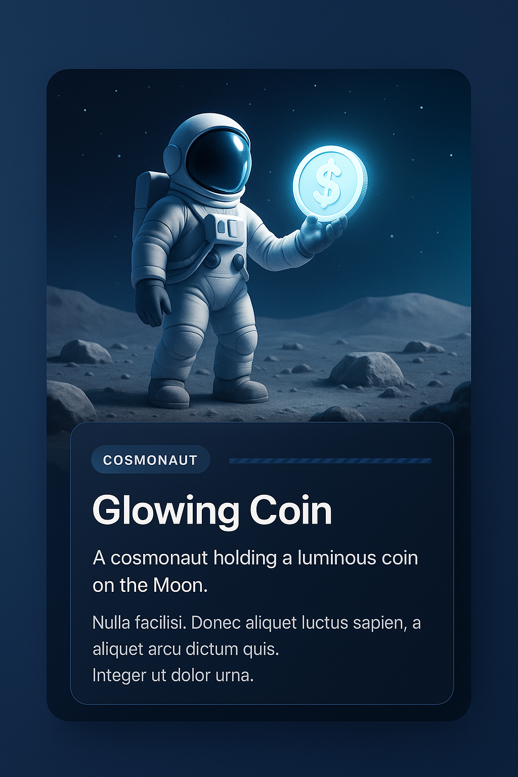 This image features a 3D illustration of a cosmonaut on the Moon, holding a glowing coin. The background showcases a dark, starry sky, enhancing the luminous effect of the coin.