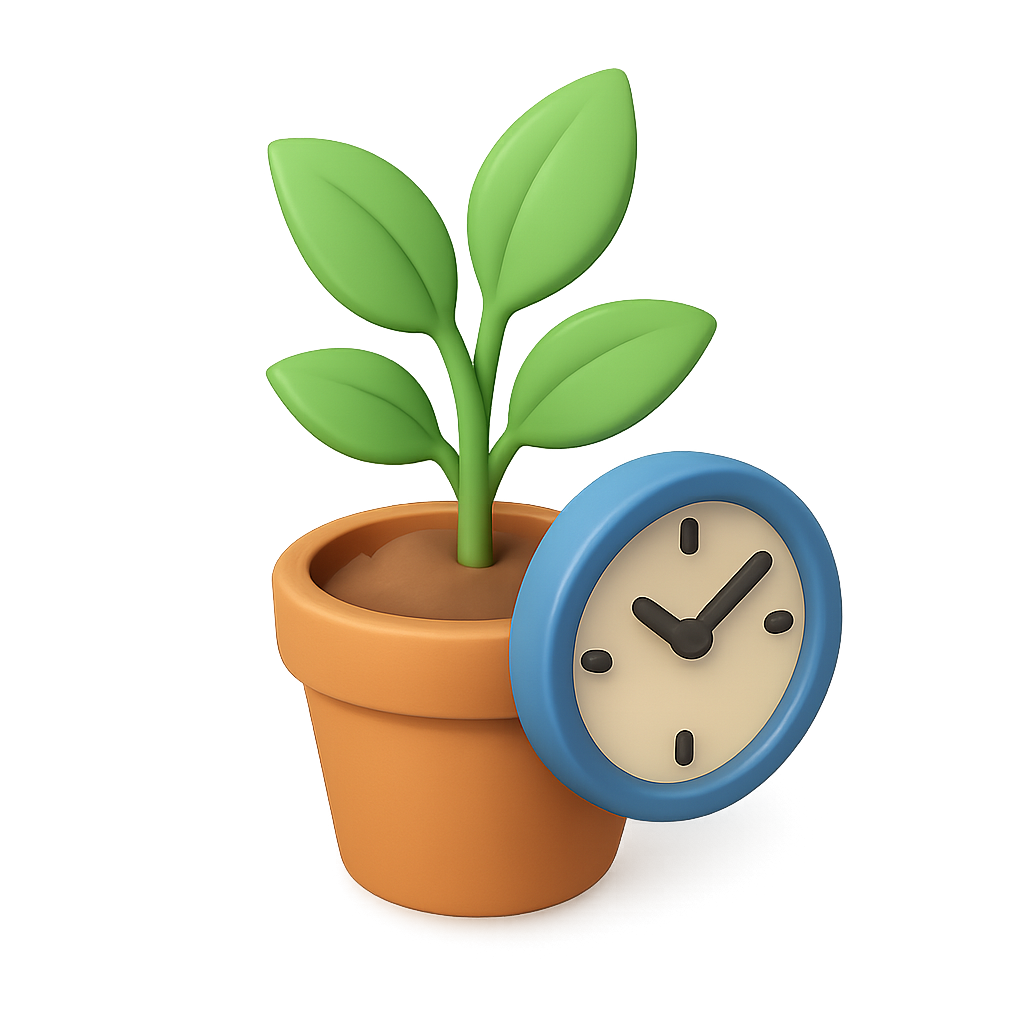 A 3D illustration of a potted plant with vibrant green leaves beside a clock. The design showcases an isometric view with a transparent background, emphasizing the three-dimensional aspect.