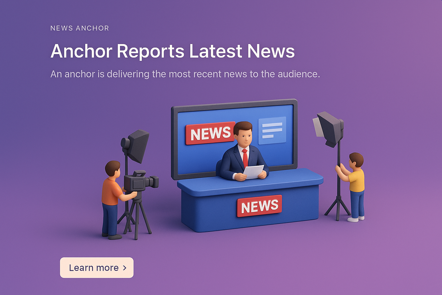 /Collection: /by davooda/Type: PNG/A detailed 3D scene featuring a news anchor at a desk, surrounded by small characters and cameras, presenting the latest news. The design includes text elements and a cohesive color scheme.