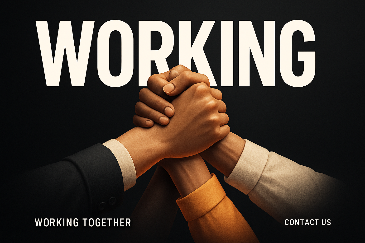 /Collection: /by davooda/Type: PNG/A powerful 3D illustration of hands united in the air against a dark gradient background. The bold word 'WORKING' dominates the upper half, emphasizing collaboration.