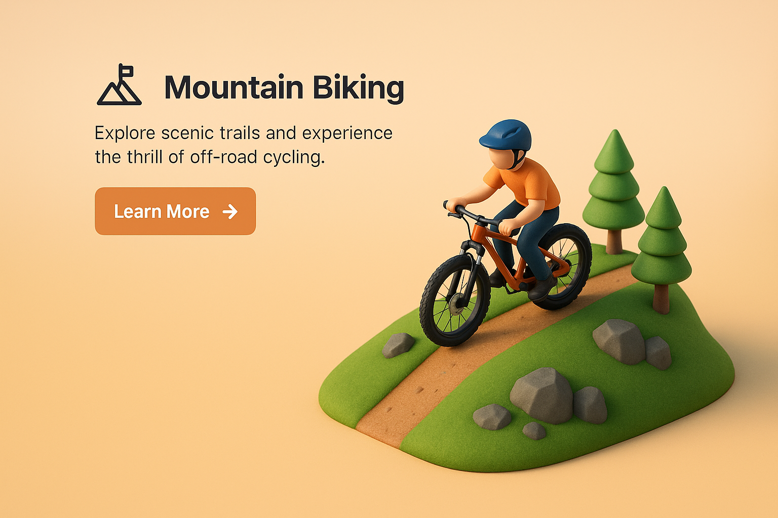 A vibrant 3D representation of mountain biking, featuring a cyclist on a trail surrounded by trees and rocks, with a smooth gradient background. Includes a call to action.