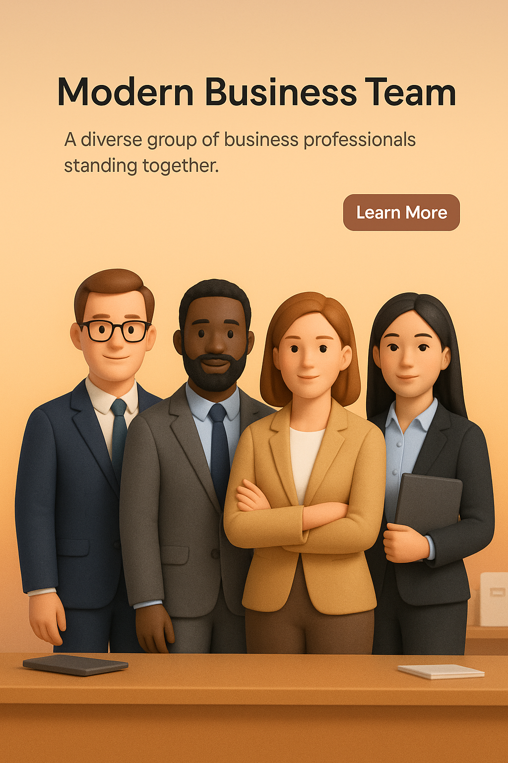 A modern 3D illustration of a diverse group of business professionals standing together, showcasing teamwork and collaboration in a corporate environment.