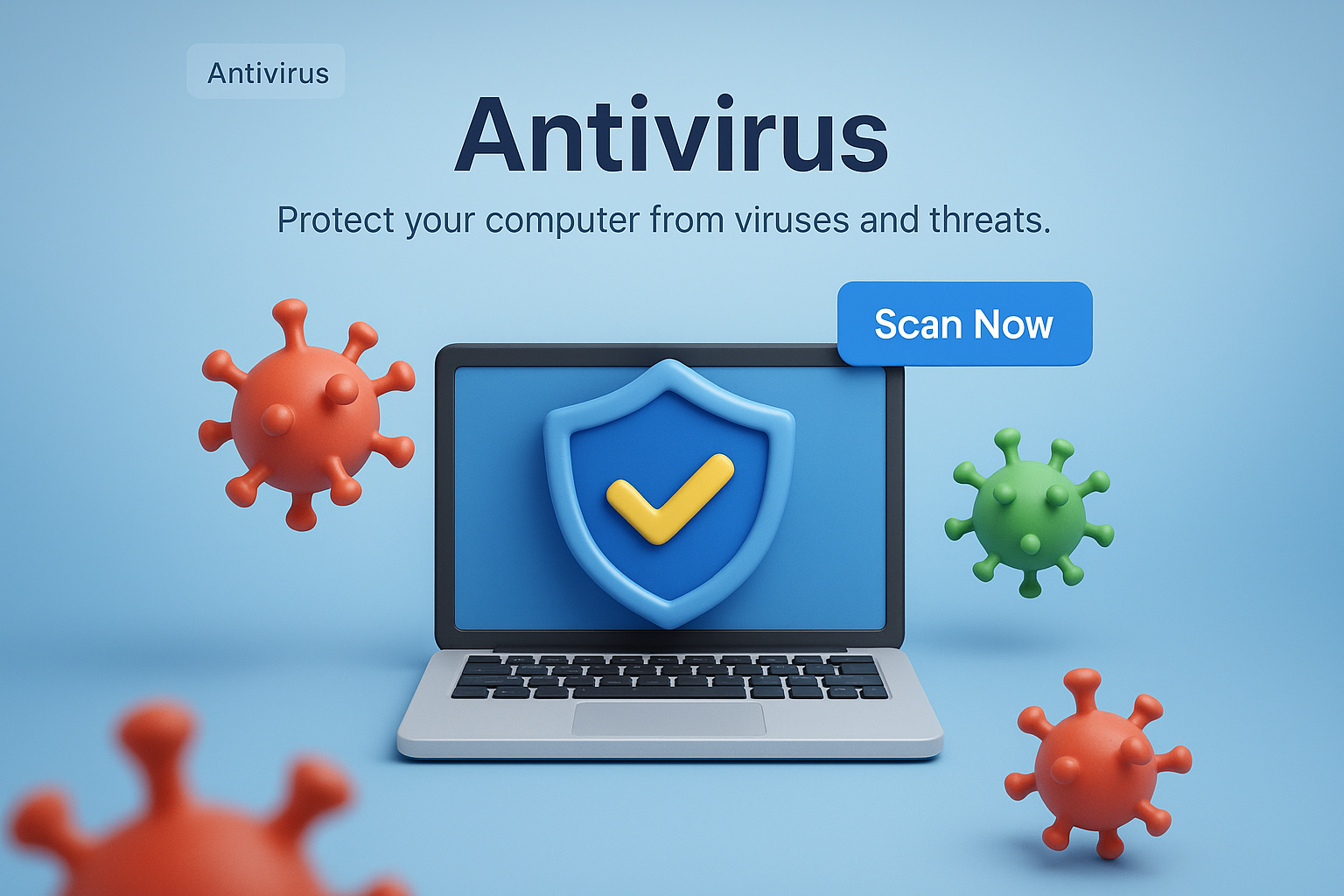 /Collection: /by davooda/Type: PNG/A zoomed-out 3D illustration depicting antivirus software. Features a laptop with a shield icon, colorful virus representations, and a call-to-action button. The design incorporates a smooth gradient background.