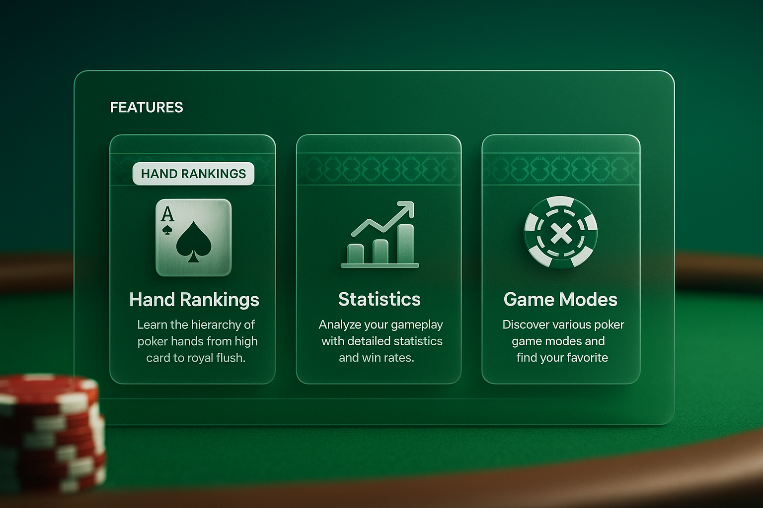 /Collection: /by davooda/Type: PNG/A visually engaging 3D illustration of a poker table felt featuring interactive blocks. Each block highlights features like hand rankings, statistics, and game modes, designed with a glass-like effect.