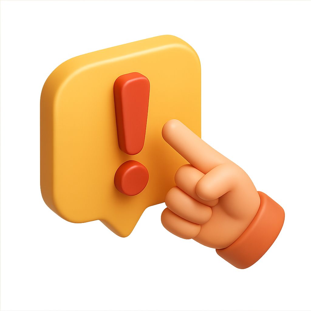 A vibrant 3D icon featuring a hand pointing at a red exclamation mark within a yellow speech bubble. The design has a three-quarter isometric view, enhancing its volumetric appearance.