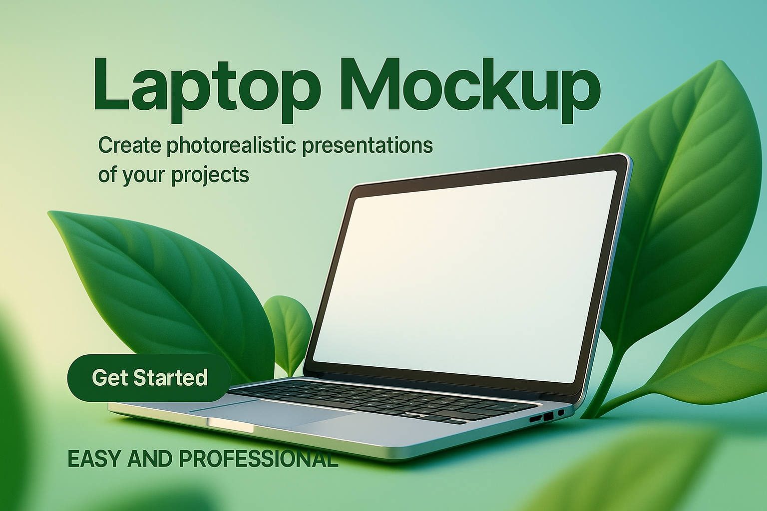 A sleek laptop mockup set against a green gradient background, complemented by lush leaves. The design emphasizes a professional aesthetic with clear, readable text.