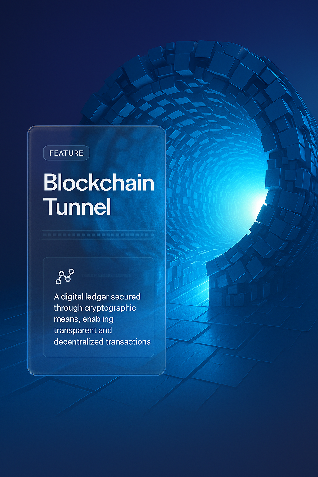 /Collection: /by davooda/Type: PNG/A visually striking 3D illustration of a blockchain tunnel leading to a glowing exit. The design features a transparent glass effect with layered components, highlighting digital ledger technology.
