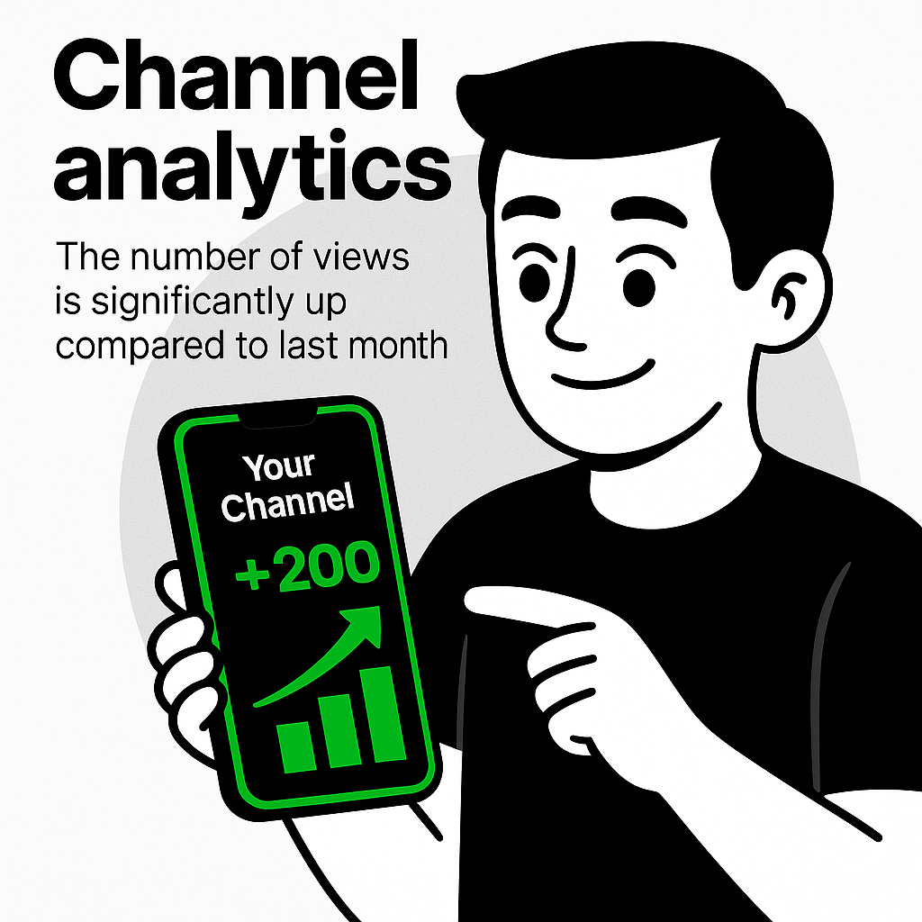 A simple and engaging graphic illustrating positive channel analytics with a character holding a smartphone displaying growth metrics, ideal for social media or presentations.