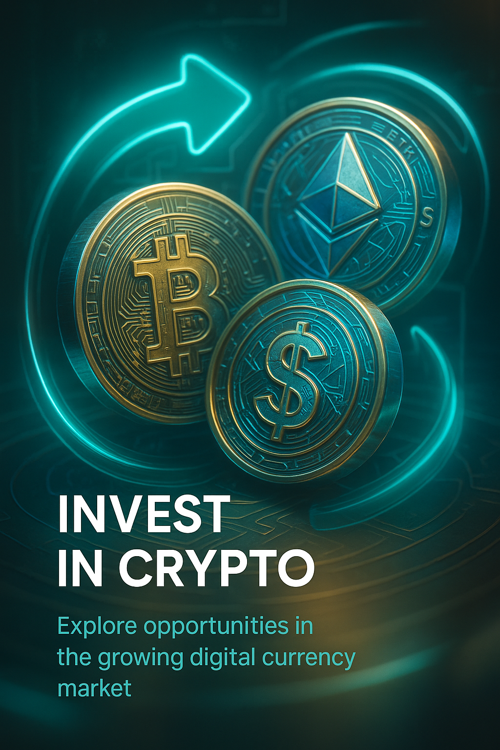 /Collection: /by davooda/Type: PNG/Vibrant digital graphic promoting cryptocurrency investment, featuring iconic coins like Bitcoin and Ethereum. Ideal for financial marketing and educational content.