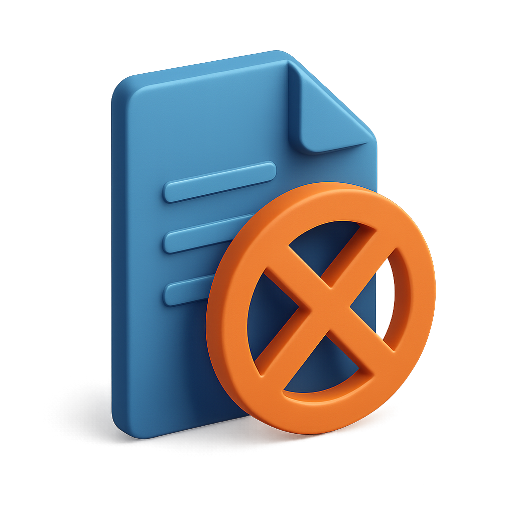 /Collection: /by davooda/Type: PNG/A 3D icon depicting a document with a banishment symbol, featuring a blue document and an orange 'X' overlay. The design is isometric with a transparent background.