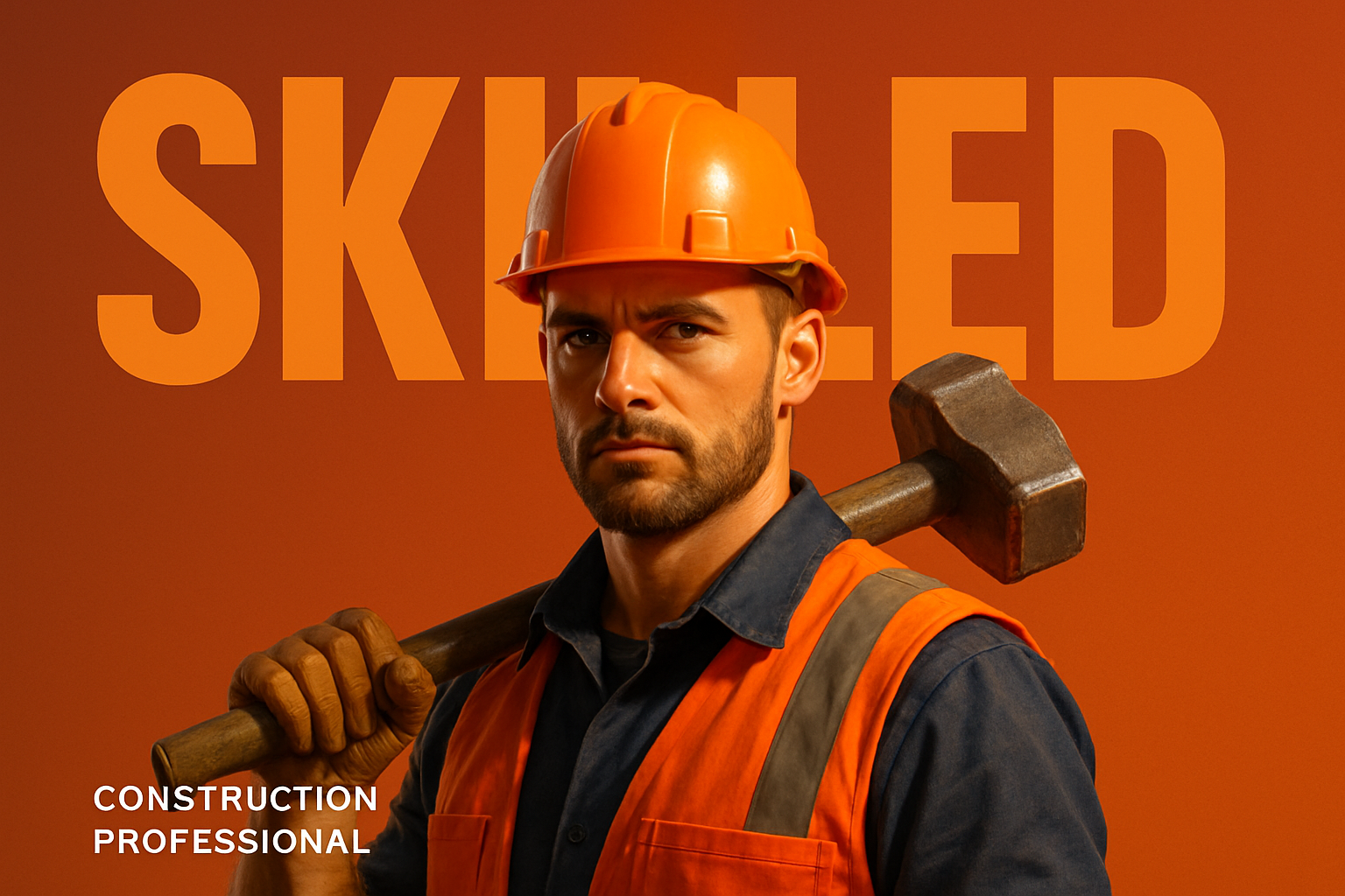 /Collection: /by davooda/Type: PNG/A striking portrait of a skilled construction professional holding a hammer, set against a bold, gradient background. The massive headline 'SKILLED' dominates the upper half, complementing the dramatic composition.