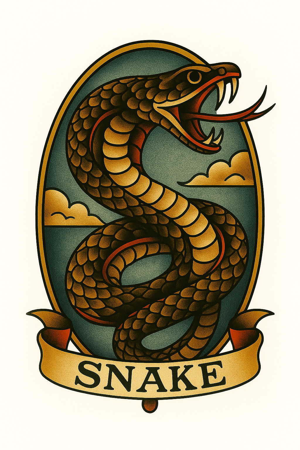 /Collection: /by davooda/Type: PNG/Intricate vintage-style illustration of a snake, featuring bold colors and a decorative banner. Ideal for tattoo art, merchandise, or graphic design projects.