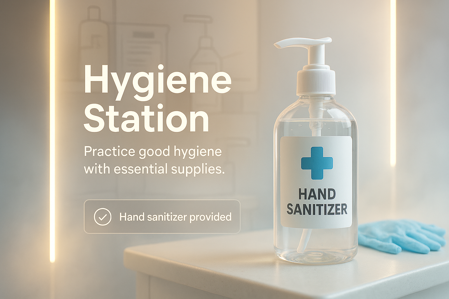 A clean and modern image showcasing a hygiene station featuring a bottle of hand sanitizer with a clear label, ideal for promoting health and safety in public spaces.
