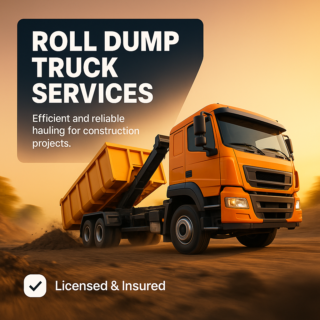 Dynamic promotional graphic featuring a roll dump truck in action, highlighting reliable hauling services for construction projects. Ideal for marketing and advertising.