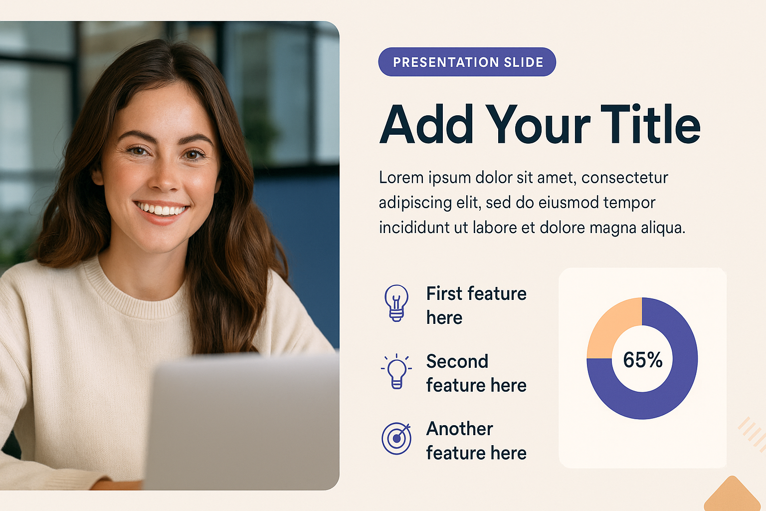 /Collection: /by davooda/Type: PNG/Modern presentation slide featuring a smiling individual, customizable title area, and infographic elements for highlighting key features, ideal for business or educational settings.
