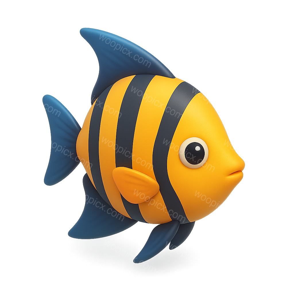 A vibrant 3D illustration of an angelfish featuring bold yellow and black stripes. The fish is presented in a three-quarter view against a soft, blurred background, enhancing its 3D effect.
