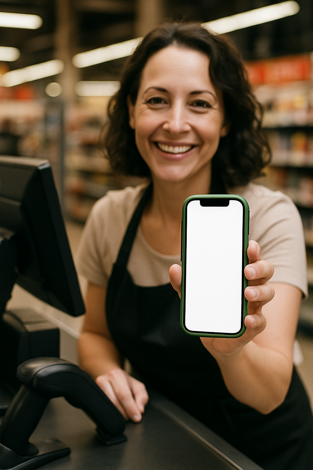 A cheerful woman cashier stands behind the counter holding a green payment phone. The screen is blank, and she is smiling, creating a vibrant atmosphere in a retail setting.