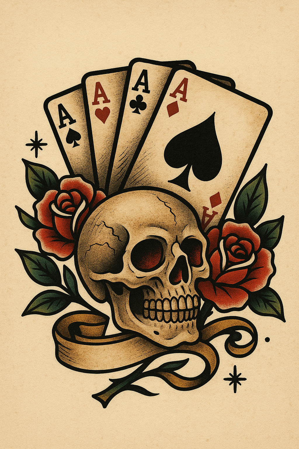 This graphic features a tattoo-style illustration of a skull with playing cards and roses, ideal for tattoo enthusiasts or vintage art lovers.