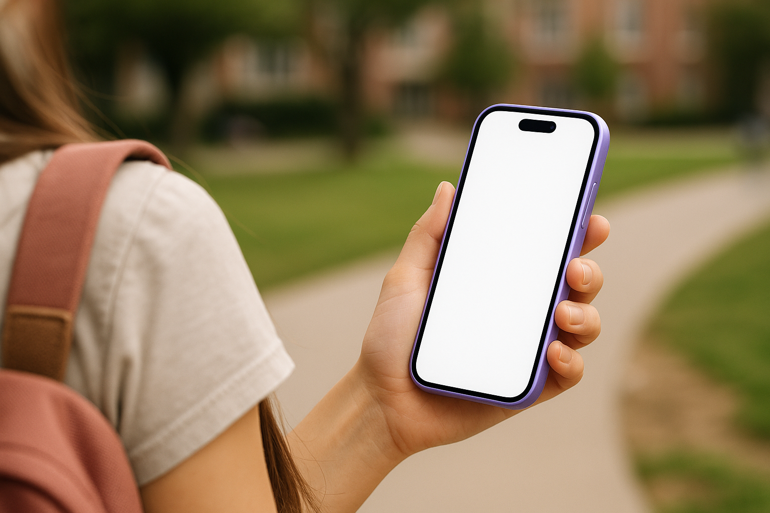 /Collection: /by davooda/Type: PNG/A student with a backpack is holding a purple phone with a blank screen, captured from behind. The scene is vibrant and lively, set in a green outdoor environment.