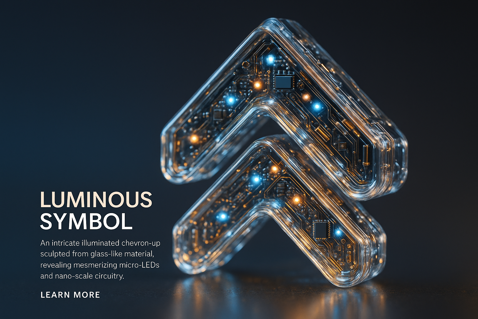/Collection: /by davooda/Type: PNG/A stunning hyperrealistic close-up of a chevron-shaped art object made from clear, glass-like polymers. It features glowing micro-LEDs and intricate circuitry, set against a gradient background.