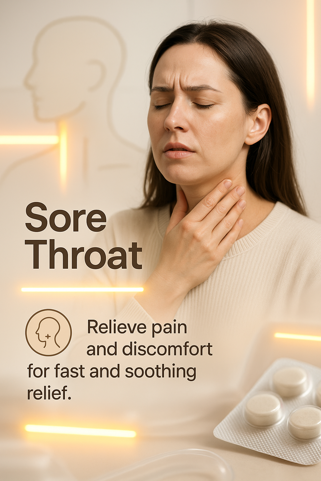 /Collection: /by davooda/Type: PNG/Informative promotional image featuring a woman experiencing throat discomfort, ideal for health-related marketing materials. The design combines soothing colors and clear messaging.