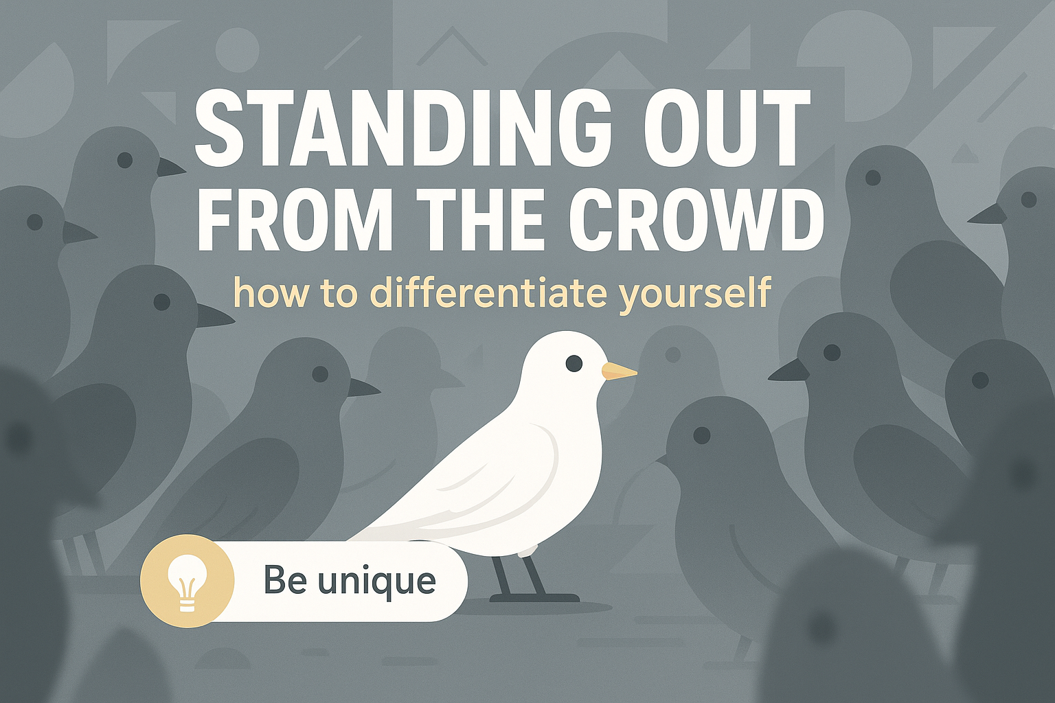 /Collection: /by davooda/Type: PNG/A visually engaging graphic illustrating the theme of individuality with a white bird among a crowd of gray birds. Ideal for presentations or social media posts focused on personal branding.