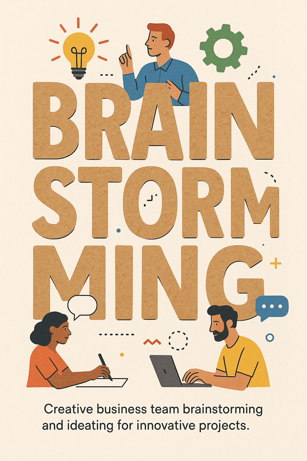 Illustrative graphic depicting a brainstorming session with diverse team members. Ideal for promoting teamwork and innovation in business contexts.