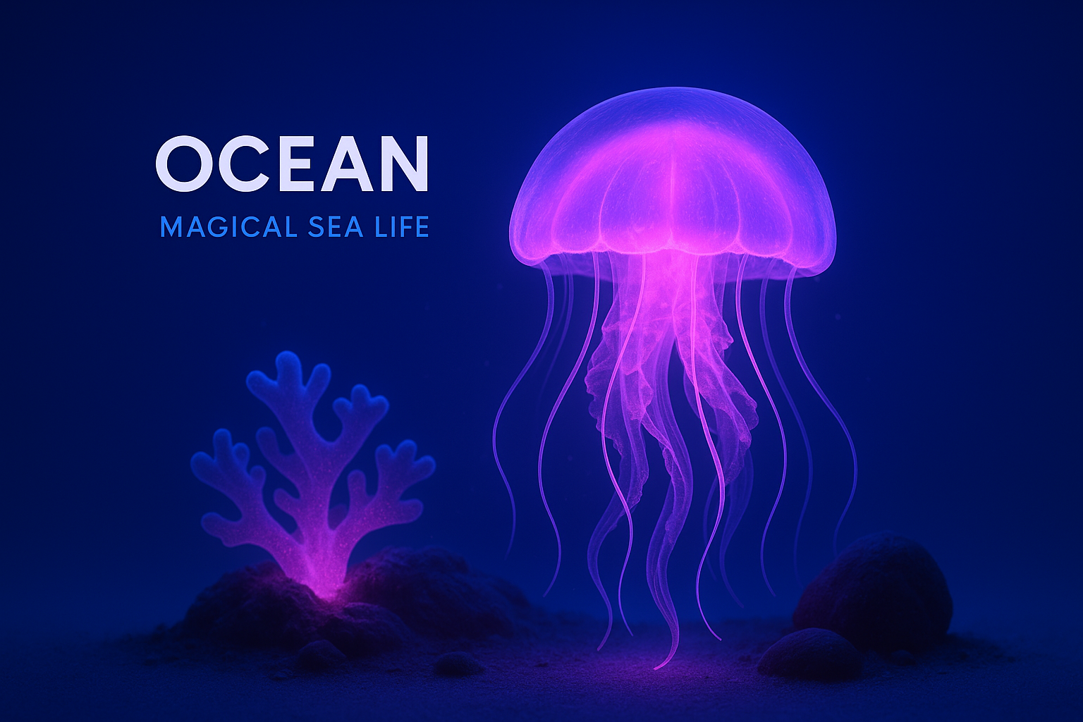 /Collection: /by davooda/Type: PNG/A captivating underwater scene featuring a luminous jellyfish and vibrant coral, set against a deep blue background. The glowing elements emit a soft neon pink light, creating a surreal atmosphere.