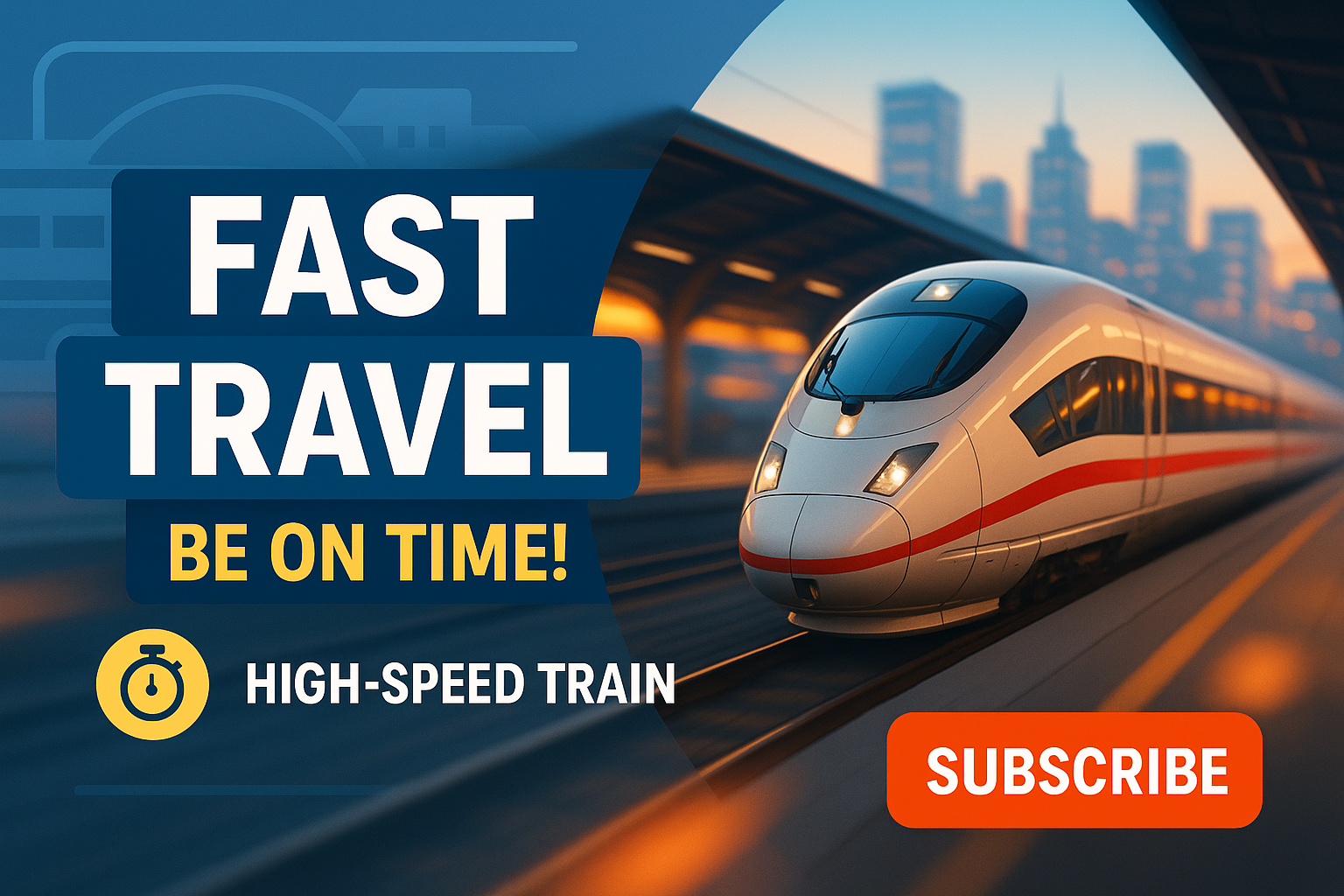 Vibrant promotional banner showcasing a high-speed train, emphasizing fast travel and punctuality, ideal for transportation marketing.