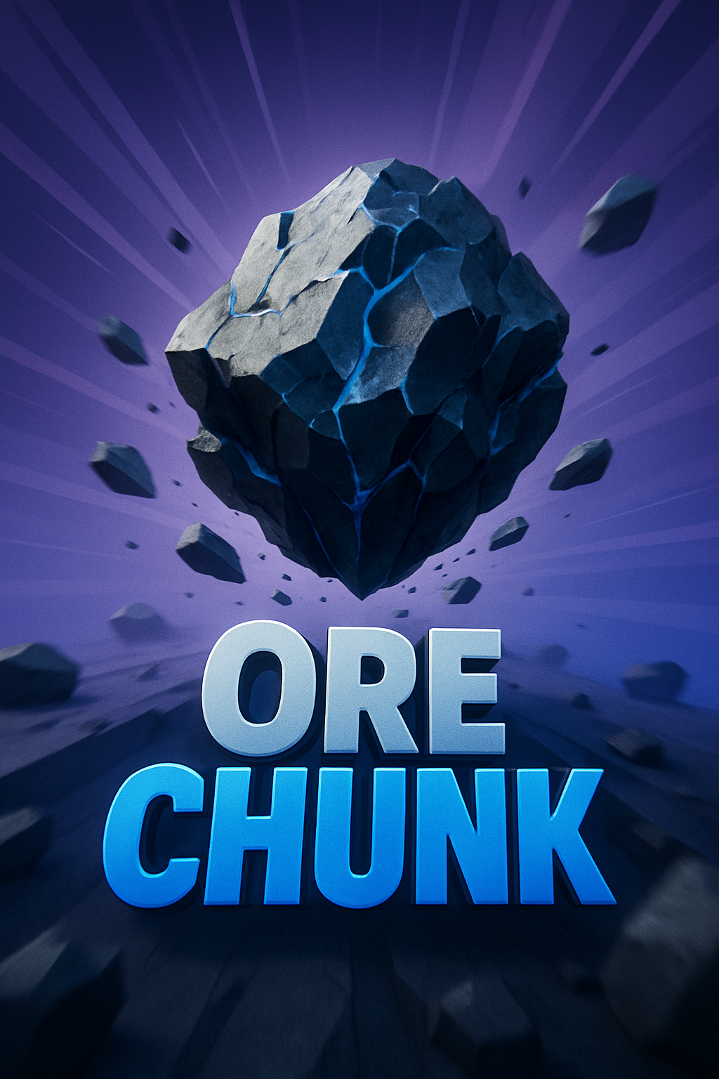 /Collection: /by davooda/Type: PNG/A striking 3D visual of an ore chunk suspended in mid-air, with dynamic rays emanating from the center. Features bold typography that emphasizes the title 'ORE CHUNK' in a contrasting blue shade against a smooth gradient background.