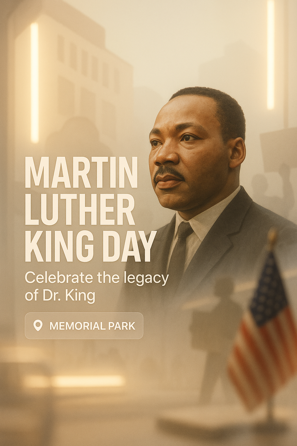 /Collection: /by davooda/Type: PNG/A commemorative graphic highlighting Martin Luther King Day with a solemn portrait of Dr. King. The design features a muted color palette and modern typography, suited for event promotion.