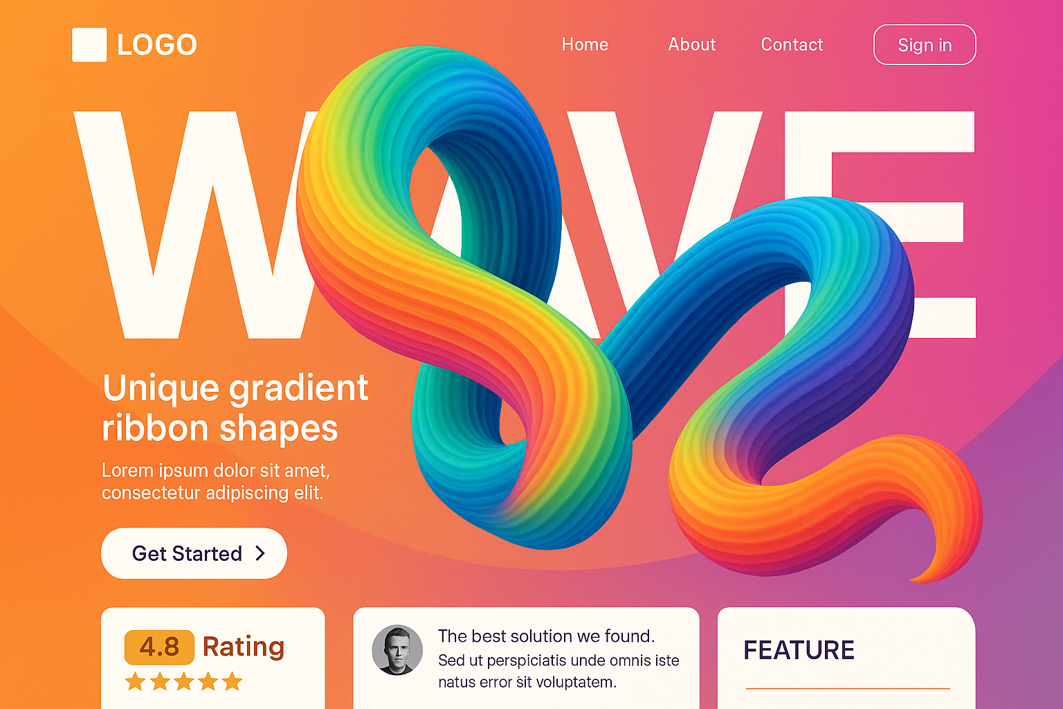 A visually striking landing page featuring a unique gradient ribbon design. The layout includes bold typography, action buttons, and marketing blocks, creating a modern and stylish experience.